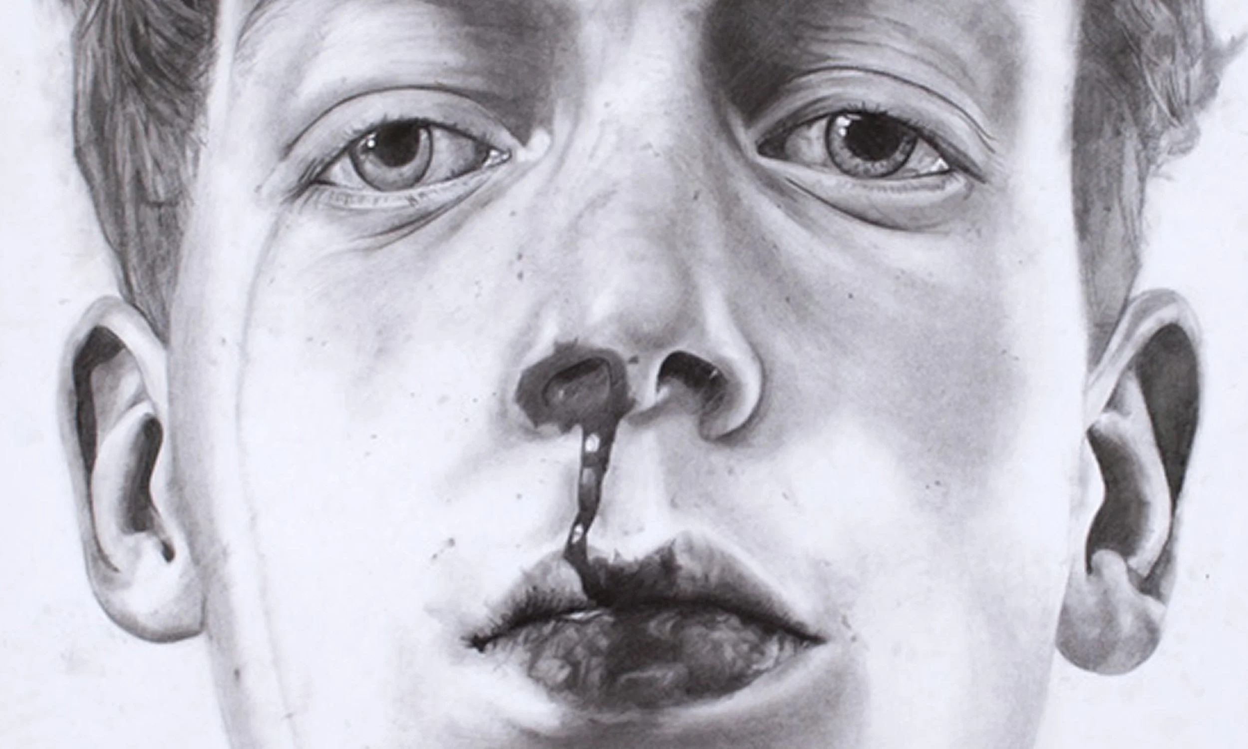 Joseph extends the forensic precision of Bryan and David, but turns inward—away from shared mythologies and toward the solitary collapse of the self under symbolic weight. A young boy bares a swastika tattoo across his chest: an image of inherited violence etched into flesh, not as political statement, but as psychic armor. The gesture—fingers in the mouth, liquid falling—evokes a moment caught between expulsion and compulsion, the body short-circuiting under the pressure of its own signs.