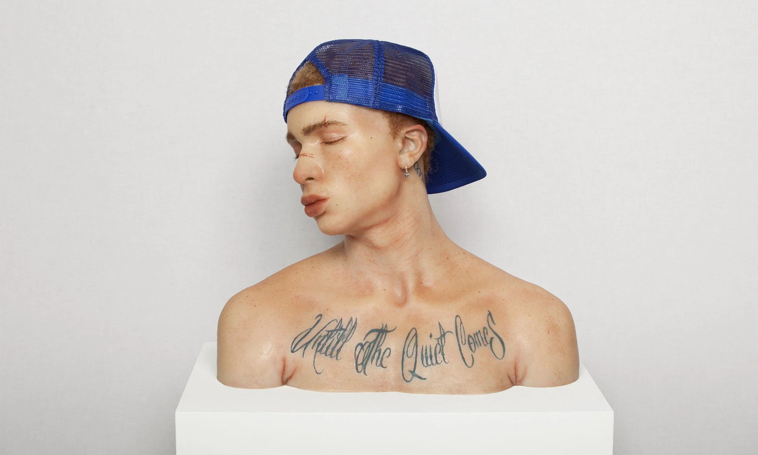 Hyperreal but unreadable. The figure looks real, but nothing moves. A teenage boy frozen mid-load: backwards cap, freckled skin, minor facial damage. Rendered in silicone and oil paint, his chest reads Until the Quiet Comes—which might be a lyric, a warning, or nothing at all.
